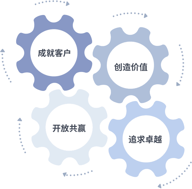成就客户是一切决策的出发点,,,创造价值是衡量所有工作的标准,,,追求卓越是我们做事做人的态度,,,开放共赢是我们的格局也是最终的结果。。。。价值观的齿轮环环相扣,,推动着组织里的每个人不断向前。。。。