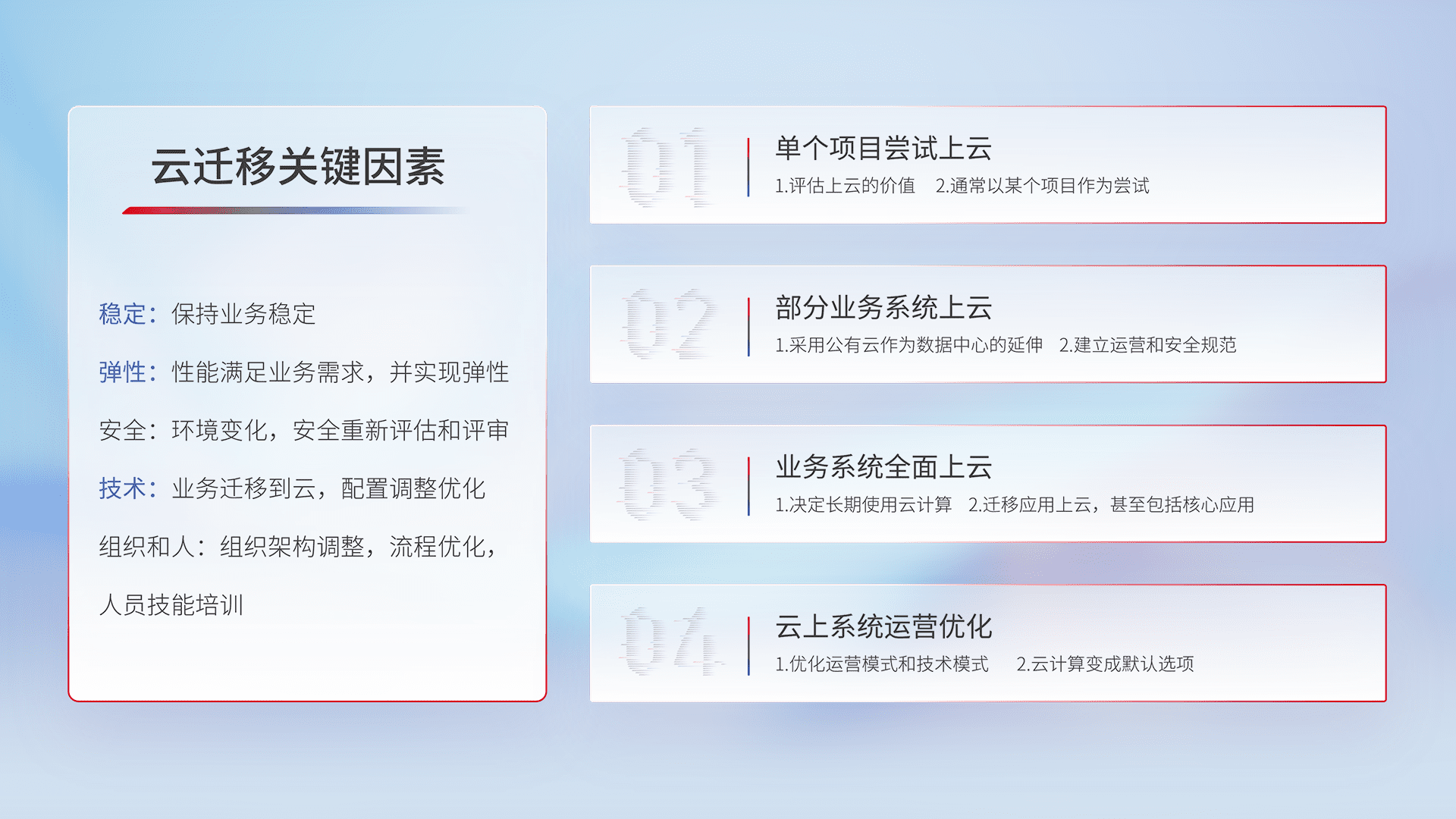 结合实际业务,,从规划设计、、、、云平台选型、、、、云原生改造、、、数据迁移、、、集成交付,,,,迁移全过程为客户识别最佳上云路径,,做好风险识别管理,,,,设计网络架构、、身份权限、、、安全审计合规、、操作审计、、、、日志审计、、监控告警策略、、、多站点容灾设计等,,,对云上基础设施进行整体规划,,,,提升IT治理水平,,以满足弹性、、、高可用、、、高性能的需求。。