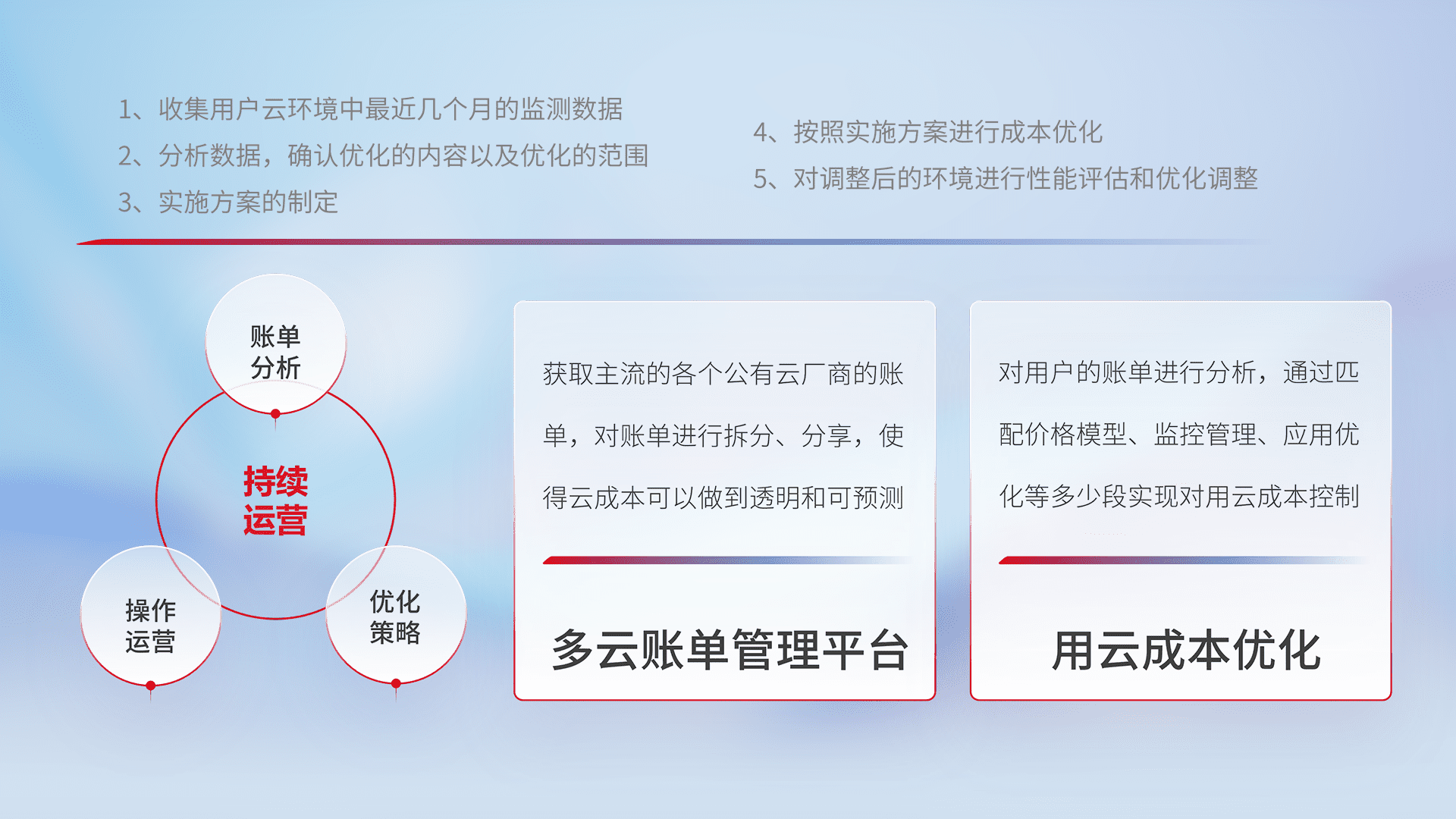 通过多云纳管,,,以统一的资源数据模型把客户的云资源进行抽象和封装,,,进而实现对多云资源的统一操作,,,保障云资源管理的可靠性、、、稳定性与可用性。。。量身定制化运维内容,,配置、、、、开发运维、、、、补丁管理、、、备份、、、、监控、、、、认证和访问管理、、、审计和日常巡检等,,,保障在用云过程中的可靠度,,,,稳定度以及高可用率。。